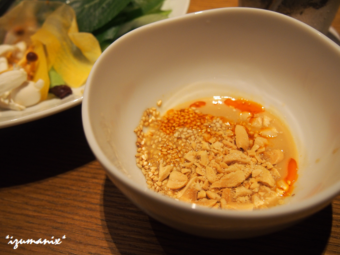 「ごまだれ、白ごま、ピーナッツ、ラー油、ガーリックチップ少々」を。
