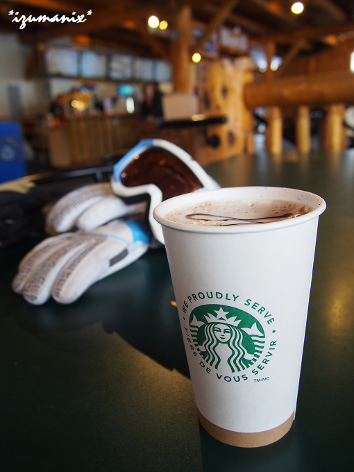 カナダ最大規模を誇るレイク・ルイーズスキー場で飲んだ、スタバのホットチョコレートです。