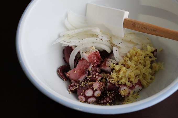 「たこの塩ポキ」を!シンプル・簡単なのに美味!ごま油の香りがクセになる。そして生姜が効いてるー!