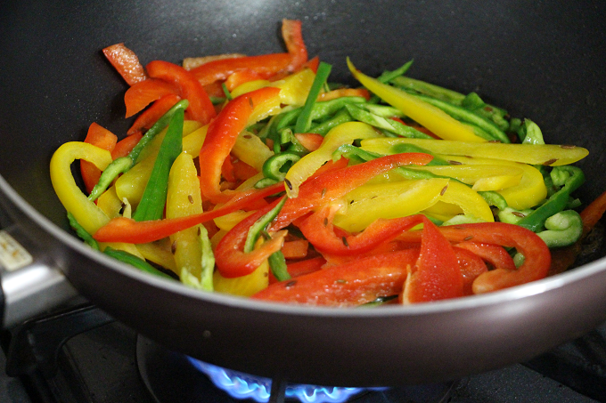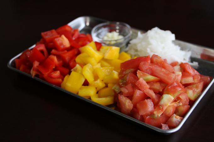 2種のパプリカを完熟トマト&玉葱と一緒にしっかり煮込み、トローリとろけるソースを作ってしまうのです。