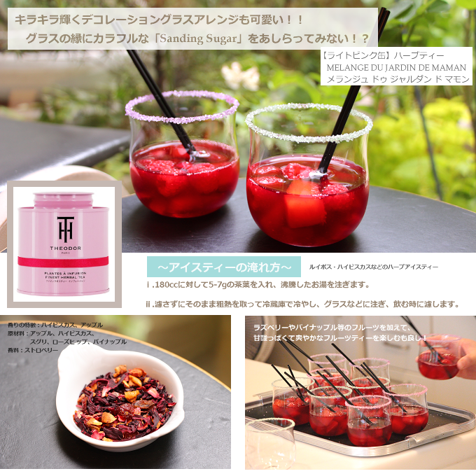 グラスの縁にサンディングシュガーをあしらって、キラキラ輝くデコレーションアレンジも施しています。