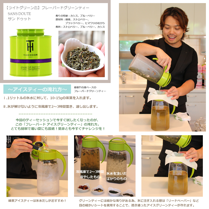 緑茶のアイスティーは氷水だしが良いそう。作っている時からも清涼感を感じます。