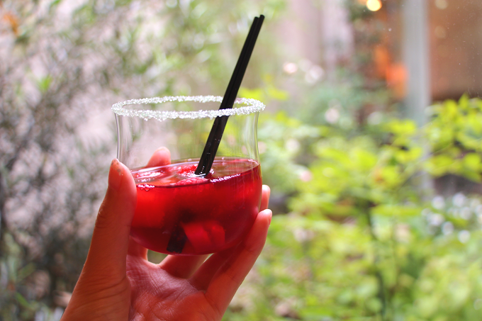キラキラの作り方は、ガラスの縁に卵白を軽く付けて、その後サンディングシュガーを塗布すればOK!