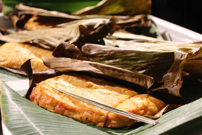 卵、キュウリが添えられていて、マレーシアでは、バナナの葉に包まれたものが街中で売られています。