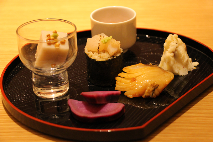 ・そば豆腐/白子ポン酢/そば寿司 炙りホタテ/いぶりがっこのポテトサラダ/紫芋のレモン煮