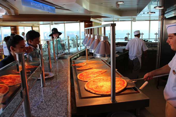 その両端には、無料の焼きたてピッツァや軽食(ホットドッグ等)も用意されています。