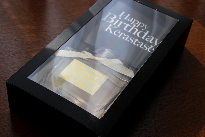 「Happy Birthday Kerastase」と描かれた、ケラスターゼ50周年を祝うルームディフューザー