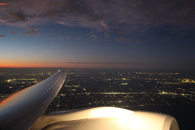 日の入り時刻に離陸したため、窓からみえる眺めは夕焼けから夜の世界へ誘われるタイミングで...幻想的!