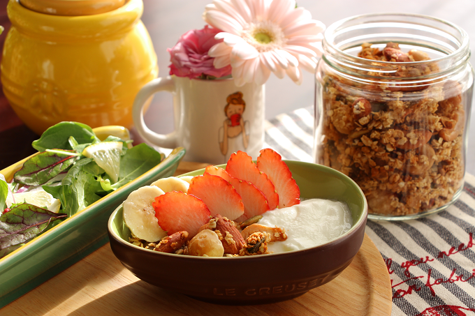 野菜と果物、そして手作りグラノーラをたっぷりと食べて、エナジーチャージの朝食を!