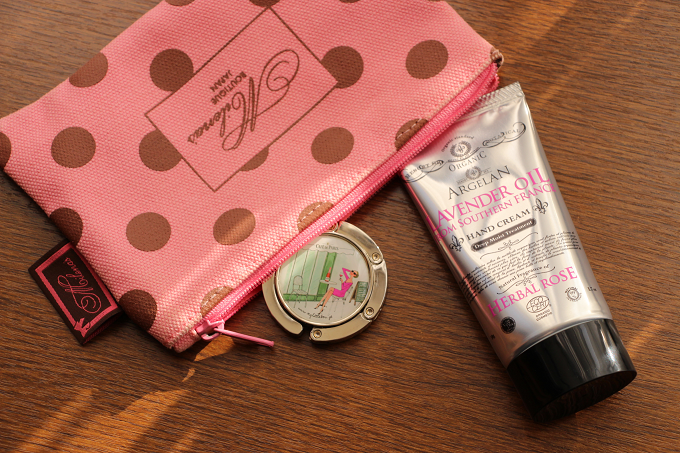 (いつも手のひらサイズのミニポーチを持ち歩いていて、過去のBoxで頂いたバッグハンガーも入れてます♪)