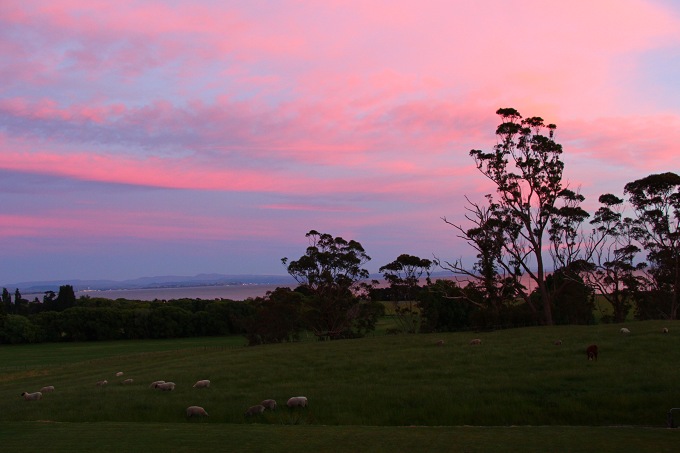 ※宿泊していたコテージより、早朝5時半に撮影。目の前には羊、その先には海(ホーク湾)が。