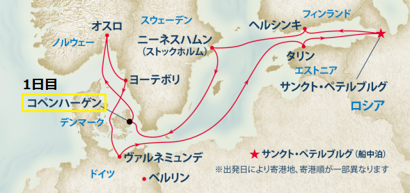 「スカンジナビアとロシア 12日間」バルト海クルーズの旅へ! 各寄港地巡りでのショアエクスカーションの様子や船内のことを、これより連載形式でご紹介します。 まずは、今回の寄港地スケジュール、乗船手続き、船室の様子をご覧下さい。
