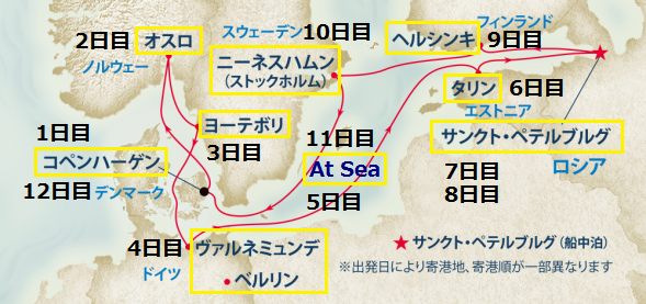 「スカンジナビアとロシア 12日間」バルト海クルーズの旅へ! 各寄港地巡りでのショアエクスカーションの様子や船内のことを、これより連載形式でご紹介します。 まずは、今回の寄港地スケジュール、乗船手続き、船室の様子をご覧下さい。