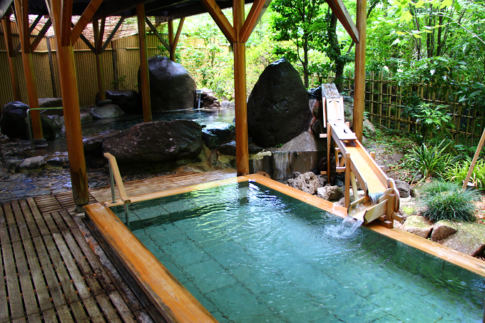 女性用には、岩風呂と檜風呂の2つの露天風呂が用意されています。