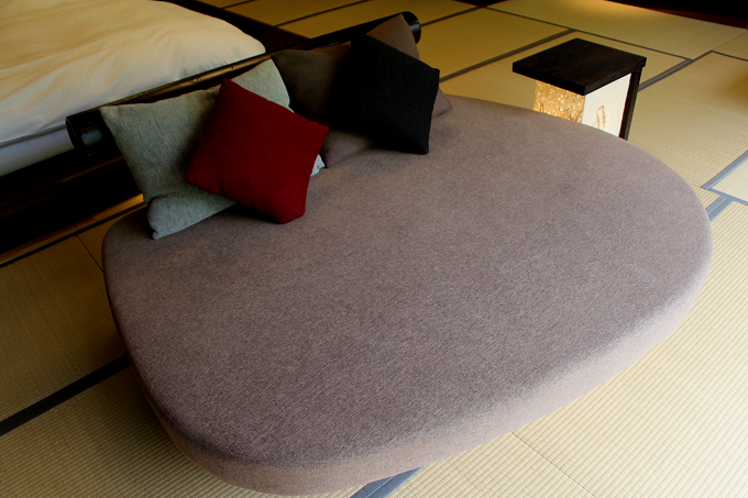 客室のなかのお気に入りの一つといえば、大きな窓に向けて配された「ごろんとソファ」!