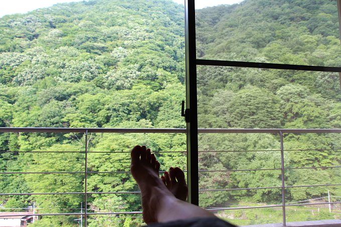 バルコニーからは渓流を望むこともできて、先ずは思いっきり深呼吸...