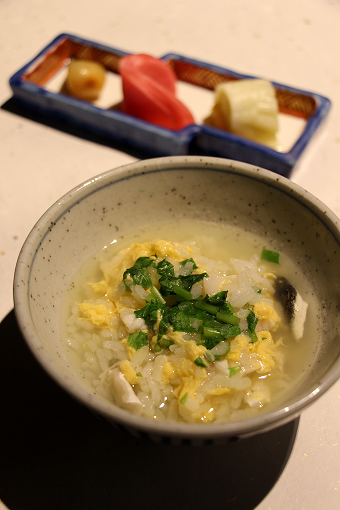 〆には雑炊を。細かくカットされたふぐの身を、改めて追加してくれるなんて最高!!