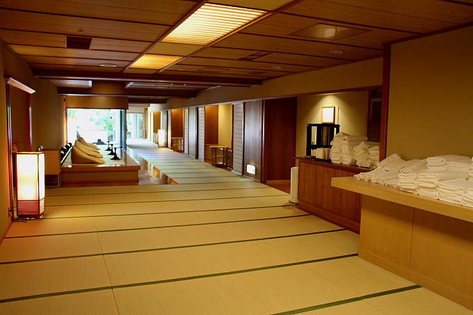 そして、畳敷きの空間にある湯上り処は広々としていて、豪快な滝と中庭を愛でることもできます。