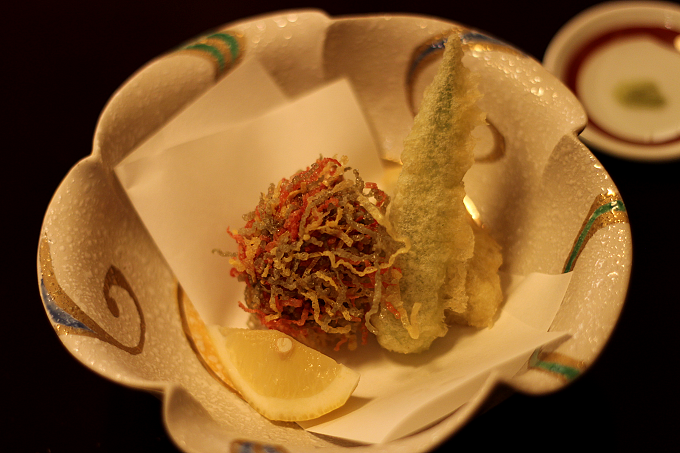 細かく刻んだ湯葉で包んで揚げた白魚や野菜の天ぷらを、