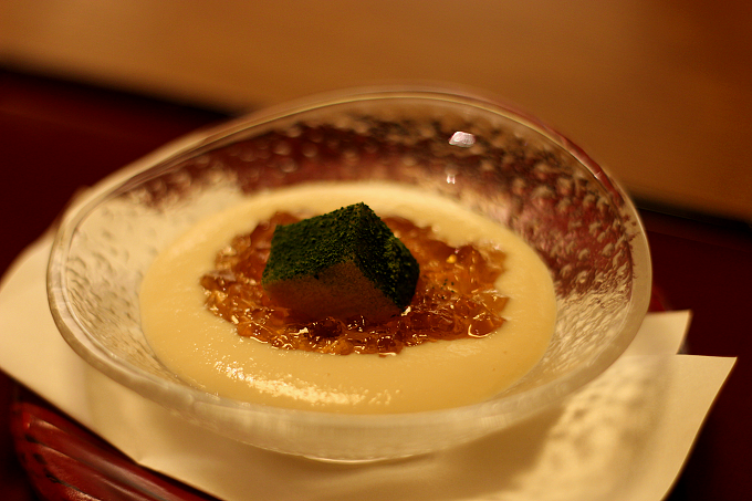 パリ・ソワールからヒントを得た作られた湯波ソワールは、冷たい湯葉と高野豆腐が、夕日に沈む太陽のよう!