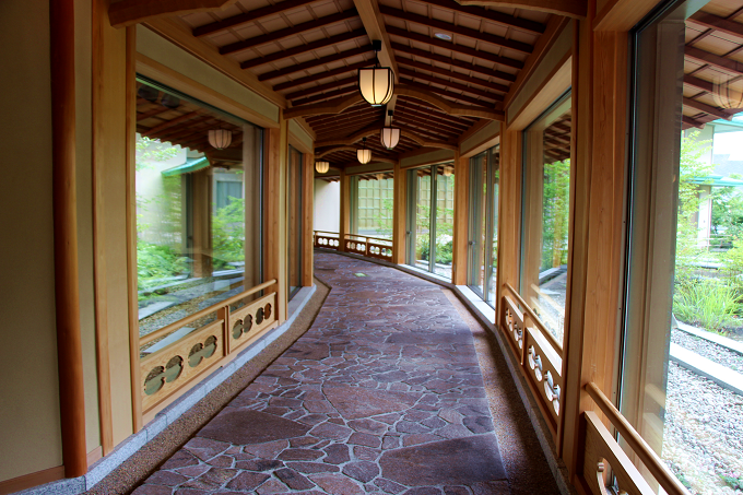 夕食自体も素晴らしかったのですが、中庭を望みながら回廊を渡った先に広がるお食事処もステキで...