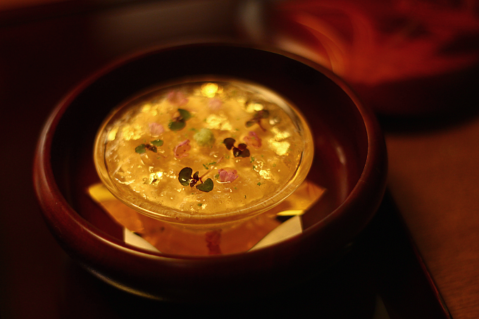 ニッコウキスゲの描かれた器の中からは、金箔があしらわれた湯波の煮こごりが。