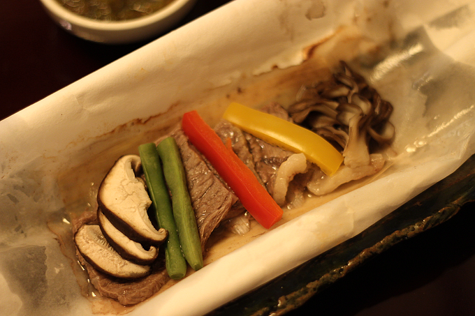 そこに湯を注ぎ、牛肉や野菜を蒸して仕上げる一品が、この会席料理の目玉の一つです。