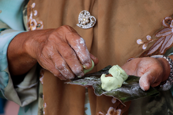黒みつとココナッツフレークの餡を、ハーブの一種パンダンリーフで香りと色づけをした生地で包み...
