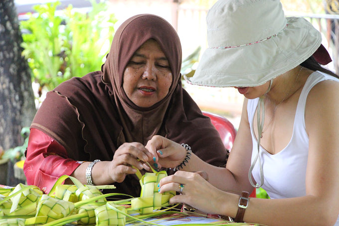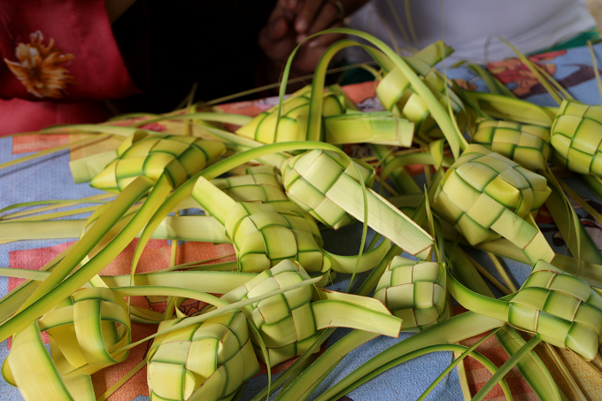 また、 ハリラヤを祝う伝統料理、「クトゥパット(ちまき)」を包む入れ物を編んでみることに。