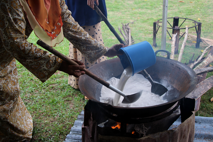 さらには、ココナッツミルクとヤシ砂糖を煮詰める作業を体験したり...