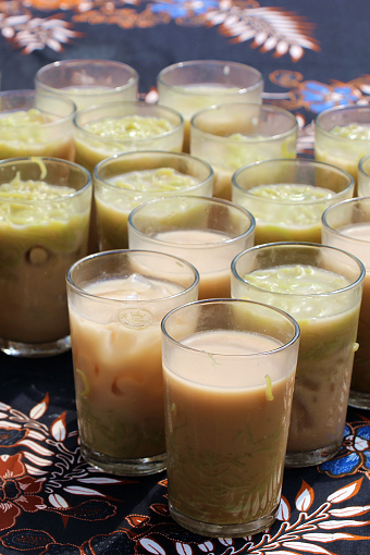 ※左:チェンドル(ココナッツミルクとパームシュガーの中には、パンダンの風味を付けた緑色の細長いゼリー)