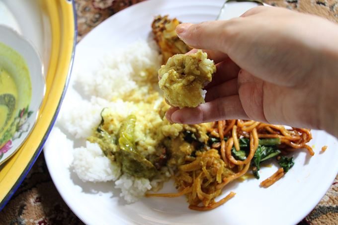 現地の方々は、右手の指先のみを使い、カレーやおかずをうまく混ぜ合わせては、