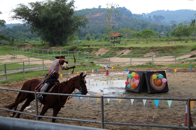 乗馬をしながらのアーチェリー体験も見どころの一つで、見事な弓裁きも見学。