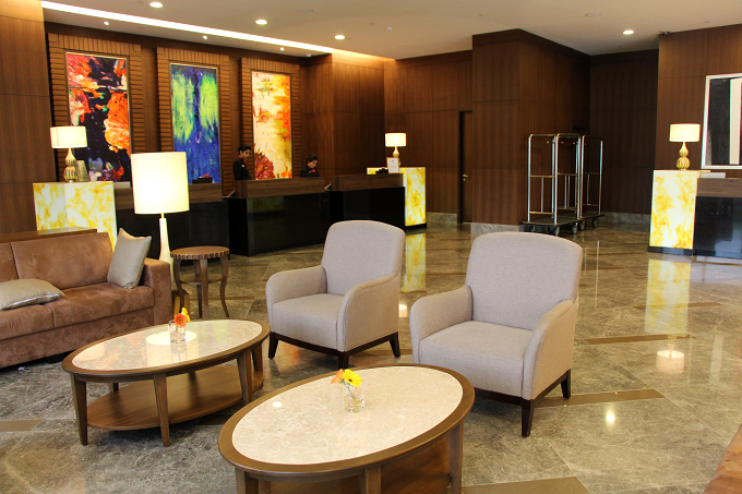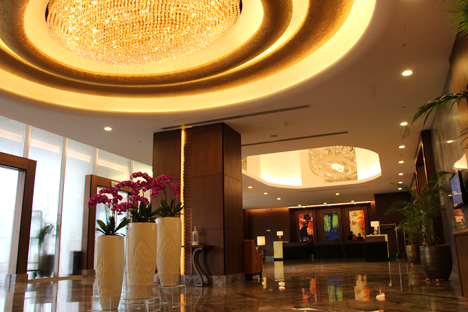 シャンデリアの輝く広々としたロビーの先には、24時間対応のフロントデスク。