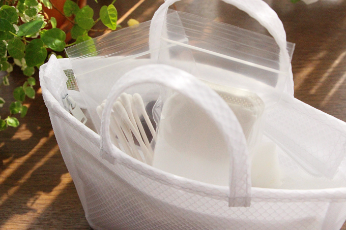 コットンと綿棒は100円均一で購入した収納パックに入れて、スパポーチの内側ポケットに。