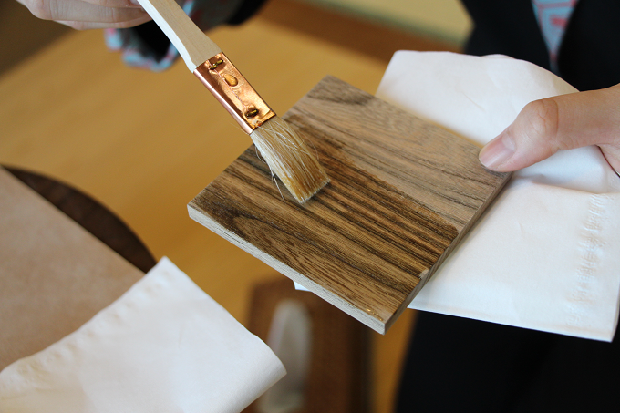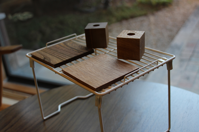 お好みの木材をセレクトしたら、やすりをかけたりするなどして、木のコースターや一輪挿しを完成させます。