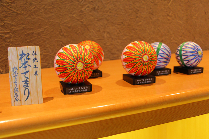 松本てまりのような器を中心に、信州サーモン、凍み豆腐、シャインマスカットなどが並びます。
