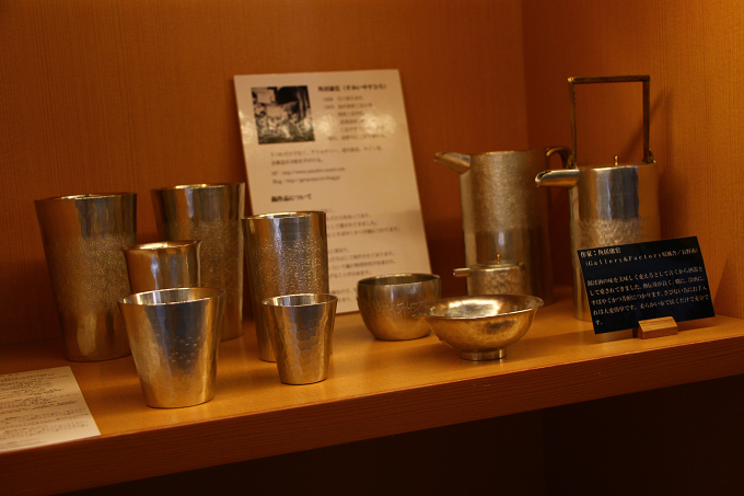 金属造形作家、角居 康宏氏の制作した、コップや酒器なども。