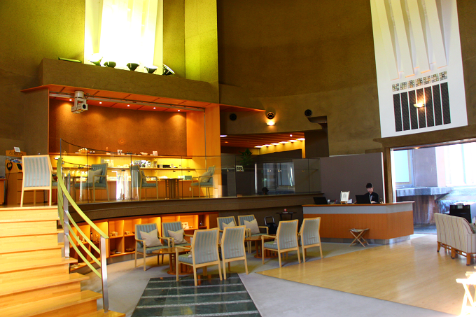 天井の高いエントランスロビーに入ると、これまで進んできたアプローチからは想像していなかった空間が。
