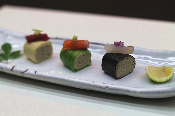 先付:三種 山の刺身 蕎麦寿司仕立て