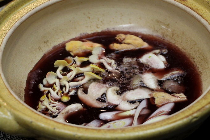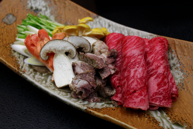 具材には、信州和牛をはじめ、トキイロヒラタケ、タモギタケなどの珍しい茸類。