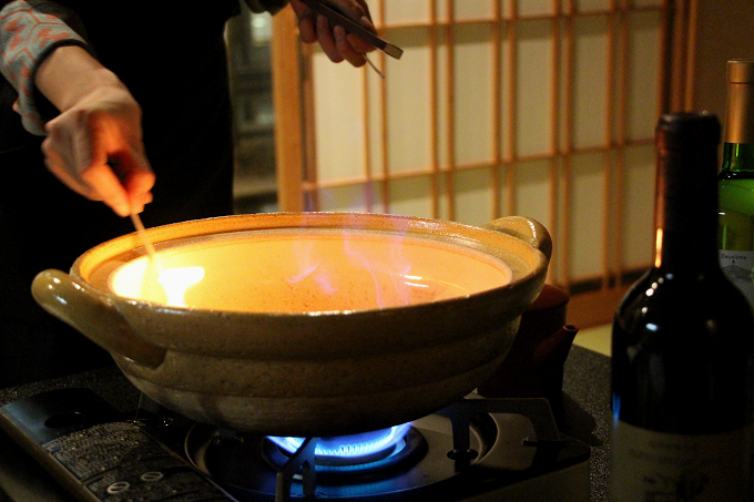 フランベの瞬間を逃すまいと、お部屋の照明を少し暗くして貰いました。(個室だからこそ出来たこと!)