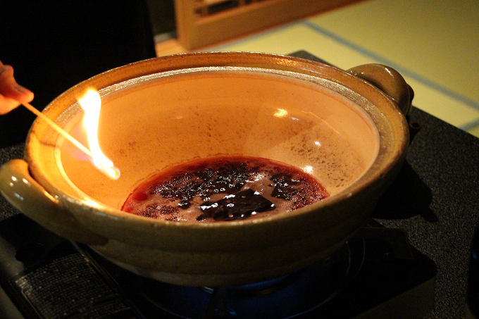 アルコールをとばすためにフランベ!