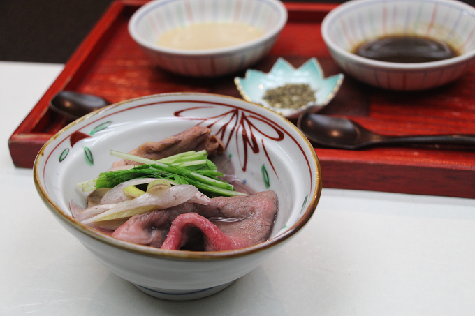 昆布などから作った「松前だれ」と塩味がきいた「ゴマだれ」のそれぞれで食すのですが、