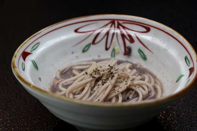 〆には信州蕎麦を。赤ワインのだし汁で頂く蕎麦って珍しいですよね。