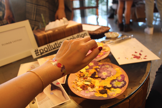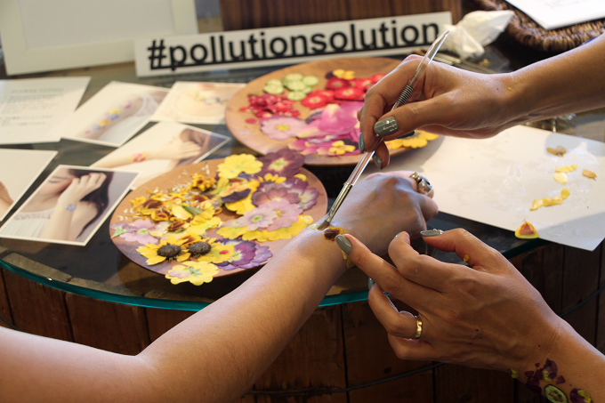 私は手首に押し花を貼り付けてもらい、ボディーフラワーを楽しんでみました。
