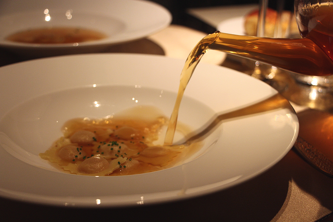 プリモピアットでは、ラビオリにコンソメを注ぐ演出も。