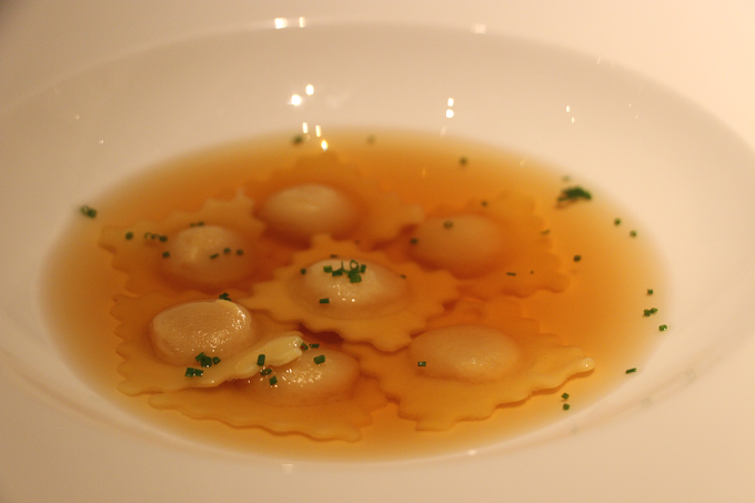 18ヶ月熟成パルマ産生ハムのコンソメは、輝くほどに透き通っていて、ラビオリが優雅に泳いでいるかのよう。