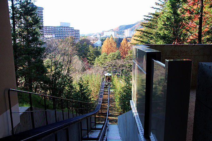 森の中を優雅に進んでいくスロープカーは、「界 鬼怒川」滞在スタートでの最初のおもてなし。