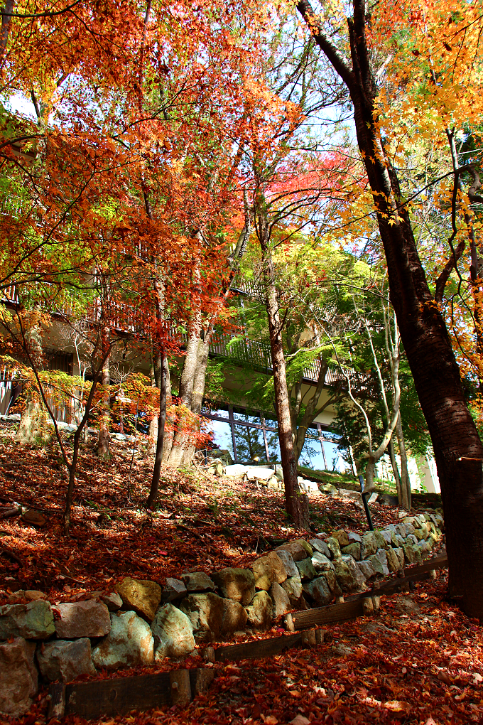 「界 鬼怒川」の敷地内の紅葉は見事!!しばらく紅葉を一人占めして散策を楽しみました。